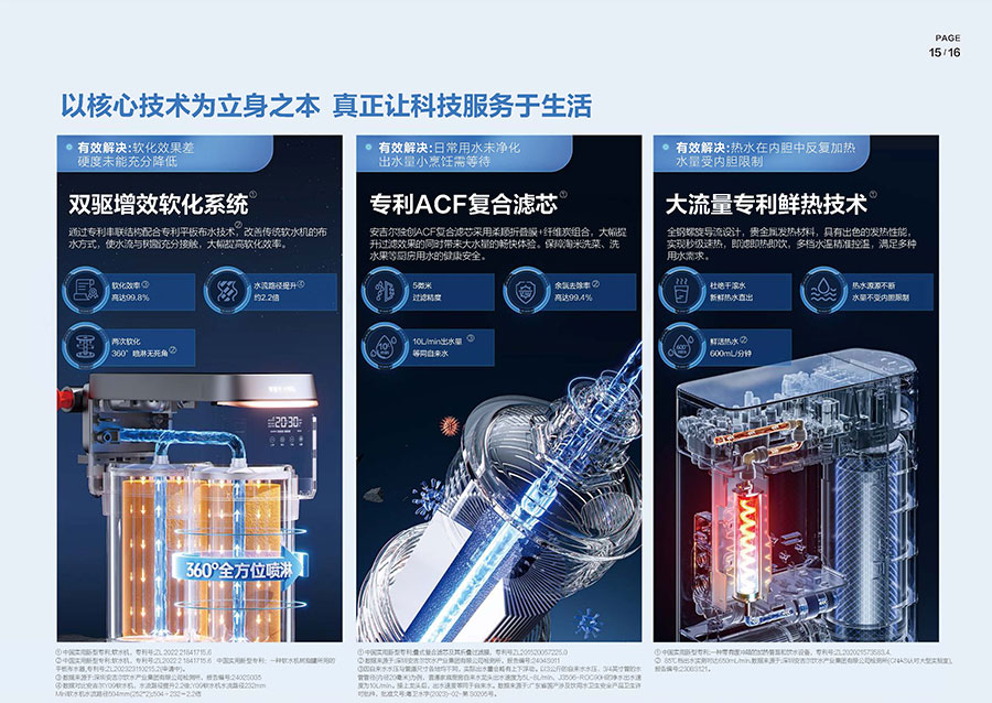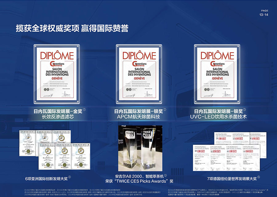 37年來,安吉爾始終堅持科技創(chuàng)新,不斷引領行業(yè)技術升級。參與17項國家及行業(yè)標準制修訂,累計獲得900余項專利,建立4大水質(zhì)實驗室。2023年,安吉爾憑實力斬獲全球9項發(fā)明獎,包含3項日內(nèi)瓦國際發(fā)明展獎項,6項亞洲創(chuàng)新發(fā)明展獎項。