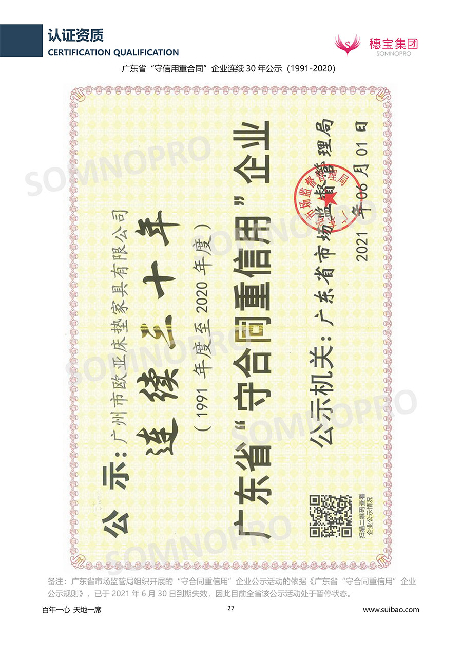 本著高品質(zhì)、高效率、重管理的原則,穗寶已通過ISO9001質(zhì)量管理體系認證證書、ISO14001環(huán)境管理體系認證證書、ISO45001職業(yè)健康安全管理體系認證證書、中國環(huán)境標志產(chǎn)品認證證書、家居綠色環(huán)保領(lǐng)跑品牌、綠色正品家居品牌、企業(yè)標準“綠色領(lǐng)跑者”證書、CMS測量管理體系證書、CMS測量管理體系證書附件、廣東省“守信用重合同”企業(yè)、廣州歐亞-納稅信用A級納稅人(連續(xù)5年:2018-2022)、2024年中國500最具價值品牌,品牌價值高達302.89億元、廣東高價值商標品牌(穗寶)、廣東省重點商標保護名錄納入證明、廣州市勞動關(guān)系和諧企業(yè)AA級。穗寶自創(chuàng)立以來,不斷致力于新產(chǎn)品的設(shè)計與研發(fā),多次在國內(nèi)家具展會屢獲獎項,產(chǎn)品暢銷國內(nèi)外,深受客戶一致好評。