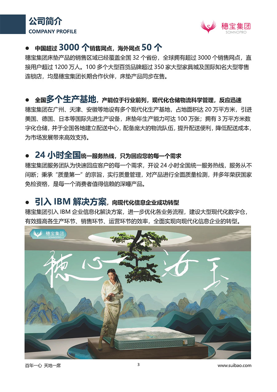 半個世紀的付出,穗寶集團在深度睡眠領(lǐng)域收獲非凡成就,贏得業(yè)界與社會的一致贊譽。作為大家居行業(yè)的品質(zhì)倡導(dǎo)者,穗寶集團不斷創(chuàng)新,豐富品牌實力,致力推動中國床墊產(chǎn)業(yè)發(fā)展。至今,穗寶集團旗下?lián)碛卸鄠€來自世界各地的優(yōu)質(zhì)品牌,包括:穗寶、詩貝艾爾、百納璐詩、睡客小鎮(zhèn)、Mr.Z早先生等;此外,穗寶集團從世界各地甄選適合不同消費者的優(yōu)質(zhì)睡眠產(chǎn)品,定制屬于您的睡眠空間。如今,穗寶集團形成以研發(fā)、生產(chǎn)和銷售床墊為主營業(yè)務(wù),涉及家具、家居裝飾、酒店配套等多項業(yè)務(wù)的企業(yè)群體。