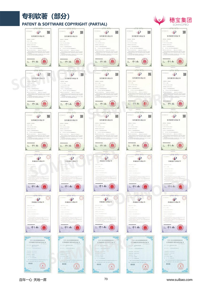 穗寶集團遍訪全球,深度整合世界優(yōu)質(zhì)資源,專注睡眠研究,與世界家具材料行業(yè)領(lǐng)導(dǎo)者禮恩派集團結(jié)成戰(zhàn)略伙伴,成立睡眠研究中心和彈簧網(wǎng)檢測中心,引入床墊鋪面耐久性測試儀,材料拉力測試儀,床墊撓度曲線測試儀,為產(chǎn)品注入優(yōu)秀基因;成功研發(fā)推出IFEEL深睡感知系統(tǒng)、X7研發(fā)系統(tǒng),關(guān)注消費者每一個細微的睡眠需求,致力于以科學(xué)的方式創(chuàng)造優(yōu)異的物理與心理助眠條件,幫助現(xiàn)代人獲得優(yōu)質(zhì)深度睡眠;不斷創(chuàng)新進取,軀位步技術(shù)、T-GUARD衡力支承系統(tǒng)等多項成果獲國內(nèi)國際專利。