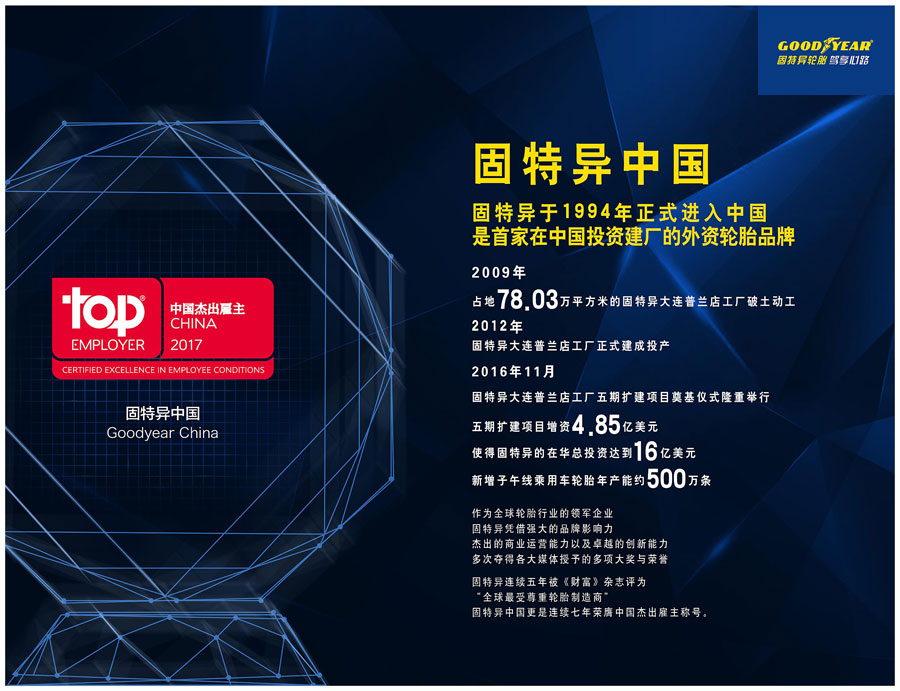 為加強(qiáng)固特異中國(guó)及周邊地區(qū)業(yè)務(wù)發(fā)展,2005年4月1日,美國(guó)固特異輪胎橡膠有限公司決定將其亞太地區(qū)總部由美國(guó)遷至中國(guó)上海。2008年固特異決定將在普蘭店建立新工廠后,該工廠將成為固特異在全球范圍內(nèi)最為先進(jìn)的綠色工廠之一。大連市政府已將其選為未來制造業(yè)投資的示范項(xiàng)目。這一全新的工廠將大大提高固特異的產(chǎn)能,使其在中國(guó)地區(qū)每年的產(chǎn)能提升至1000萬條高附加值乘用車輪胎,以及100萬條商用車輪胎。目前,固特異已經(jīng)將全部輪胎的生產(chǎn)從大連舊工廠遷至普蘭店新工廠。