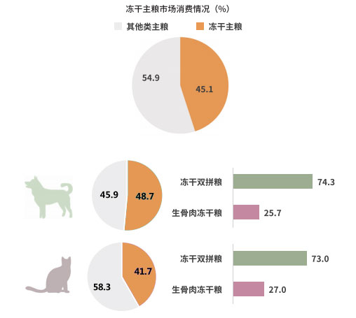 據(jù)朗諾與派讀調(diào)研數(shù)據(jù)顯示,目前,寵物凍干類(lèi)產(chǎn)品在主糧、零食市場(chǎng)的偏好度均持續(xù)提升,凍干主糧在犬、貓糧中的滲透率分別為 48.7%、41.7%,凍干零食的滲透率則為 45.4%。其中凍干雙拼糧仍是最受寵物主歡迎的主糧產(chǎn)品,貓凍干主糧及零食市場(chǎng)仍有較大的增長(zhǎng)空間與市場(chǎng)潛力。