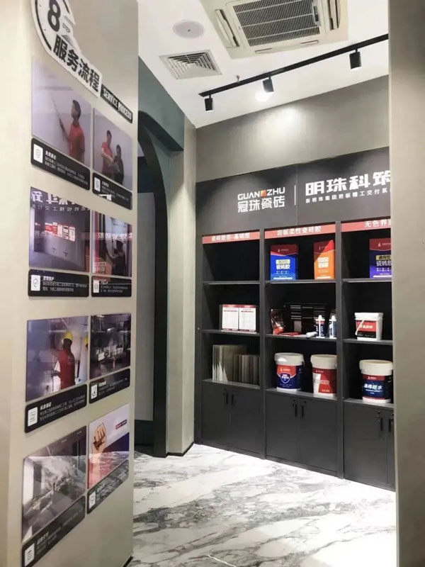 ▲冠珠授權(quán)門(mén)店中,關(guān)于“明珠科筑”巖板精工交付系統(tǒng)的展示