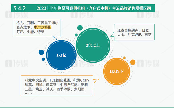 上半年,受益于中高端領域依舊保持穩(wěn)定的消費力度,熱泵兩聯(lián)供(含戶式水機)市場以增長19.1%的成績,展現(xiàn)出了其作為“潛力股”的市場活力。中廣歐特斯地暖熱泵空調(含戶式水機)等在上半年的熱泵兩聯(lián)供機組(含戶式水機)主流品牌銷售規(guī)模區(qū)間中,處于1~2億銷售規(guī)模位置,是除國外品牌外持續(xù)領跑的民族品牌。