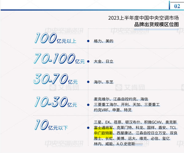 經過多年的發(fā)展,中國中央空調市場的品牌格局基本穩(wěn)定。結合2023上半年各品牌的市場表現(xiàn),該報告將品牌出貨規(guī)模區(qū)位分為5大陣營,其中,中廣歐特斯在10億元以下規(guī)模榜上有名。