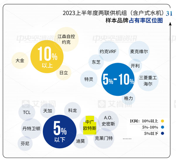 2023上半年,中廣歐特斯在渠道推廣和產品研發(fā)上不斷發(fā)力,兩聯(lián)供機組市場開拓取得了一定的成績,并在2023上半年度兩聯(lián)供機組(含戶式水機)樣本品牌占有率上展示出一定的表現(xiàn)力,與科龍中央空調、天加、TCL智能暖通等國貨品牌并肩前行,占有率均為5%以下。