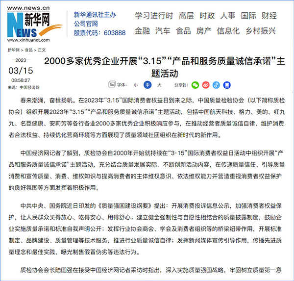 中國(guó)經(jīng)濟(jì)網(wǎng):2000多家優(yōu)秀企業(yè)開(kāi)展“3·15”“產(chǎn)品和服務(wù)質(zhì)量誠(chéng)信承諾”主題活動(dòng)