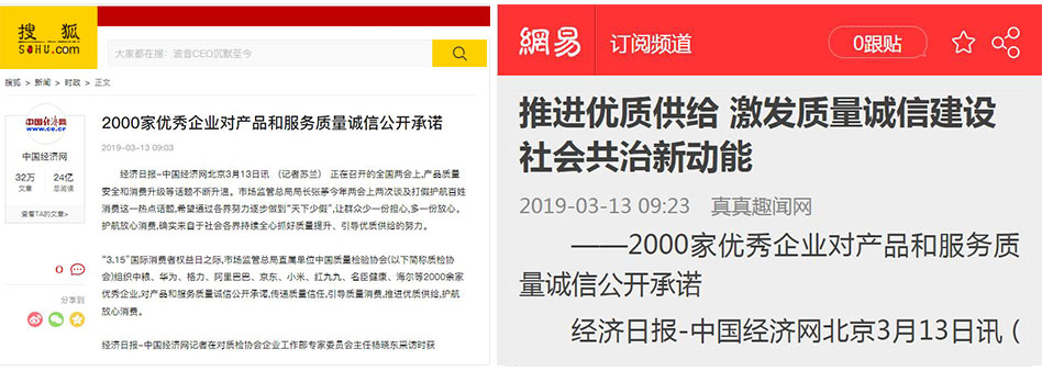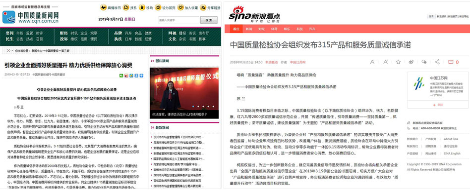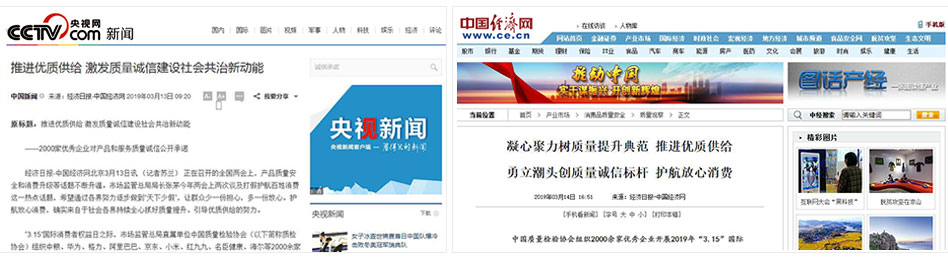 •中國(guó)消費(fèi)網(wǎng)《傳遞質(zhì)量信任,引導(dǎo)質(zhì)量消費(fèi)——中國(guó)質(zhì)量檢驗(yàn)協(xié)會(huì)在2019年3.15組織2000家優(yōu)秀企業(yè)對(duì)產(chǎn)品和服務(wù)質(zhì)量作出誠(chéng)信承諾》