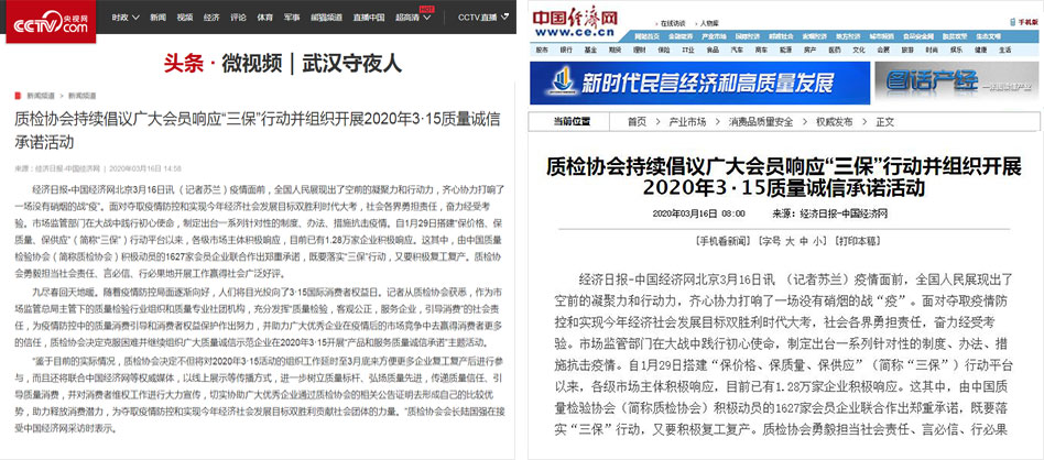 中國經(jīng)濟(jì)網(wǎng)《助力企業(yè)復(fù)工復(fù)產(chǎn)抓好質(zhì)量提升 發(fā)揮社會組織職能保障放心消費(fèi)——中國質(zhì)量檢驗協(xié)會組織開展2020年3.15產(chǎn)品和服務(wù)質(zhì)量誠信承諾主題活動》