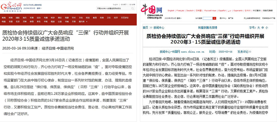 光明網(wǎng)《質(zhì)檢協(xié)會持續(xù)倡議廣大會員響應(yīng)“三保”行動并組織開展2020年3·15質(zhì)量誠信承諾活動》