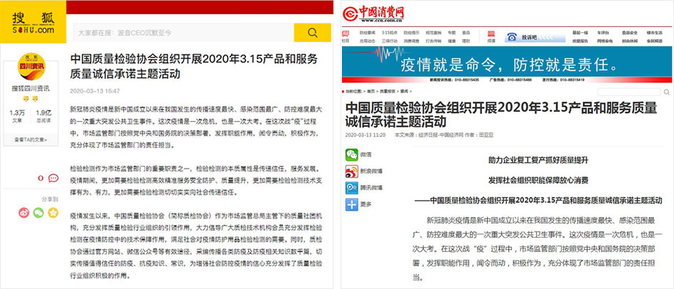 搜狐網(wǎng)《中國質(zhì)量檢驗協(xié)會組織開展2020年3.15產(chǎn)品和服務(wù)質(zhì)量誠信承諾主題活動》
