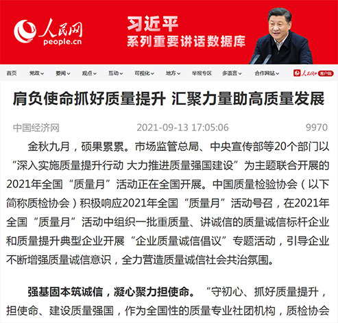中國(guó)經(jīng)濟(jì)網(wǎng):肩負(fù)使命抓好質(zhì)量提升 匯聚力量助高質(zhì)量發(fā)展——中國(guó)質(zhì)量檢驗(yàn)協(xié)會(huì)組織開(kāi)展2021年全國(guó)“質(zhì)量月”企業(yè)質(zhì)量誠(chéng)信倡議專(zhuān)題活動(dòng)