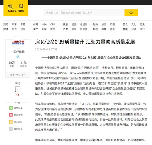 搜狐網(wǎng):肩負(fù)使命抓好質(zhì)量提升 匯聚力量助高質(zhì)量發(fā)展——中國(guó)質(zhì)量檢驗(yàn)協(xié)會(huì)組織開(kāi)展2021年全國(guó)“質(zhì)量月”企業(yè)質(zhì)量誠(chéng)信倡議專(zhuān)題活動(dòng)