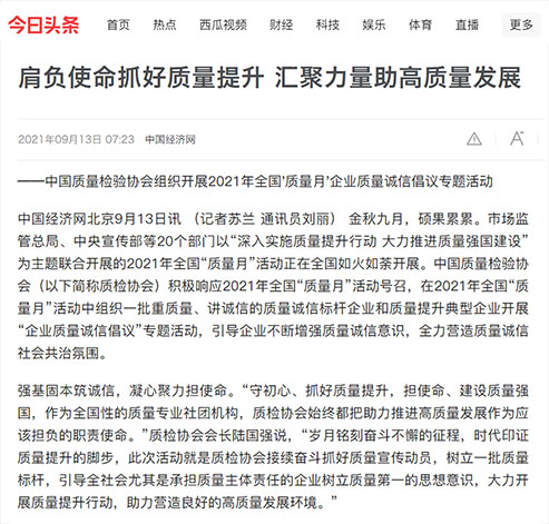 中國(guó)經(jīng)濟(jì)網(wǎng):堅(jiān)持質(zhì)量第一 抓好質(zhì)量提升 共筑質(zhì)量誠(chéng)信 建設(shè)質(zhì)量強(qiáng)國(guó)——2021年全國(guó)“質(zhì)量月”企業(yè)質(zhì)量誠(chéng)信倡議書(shū)