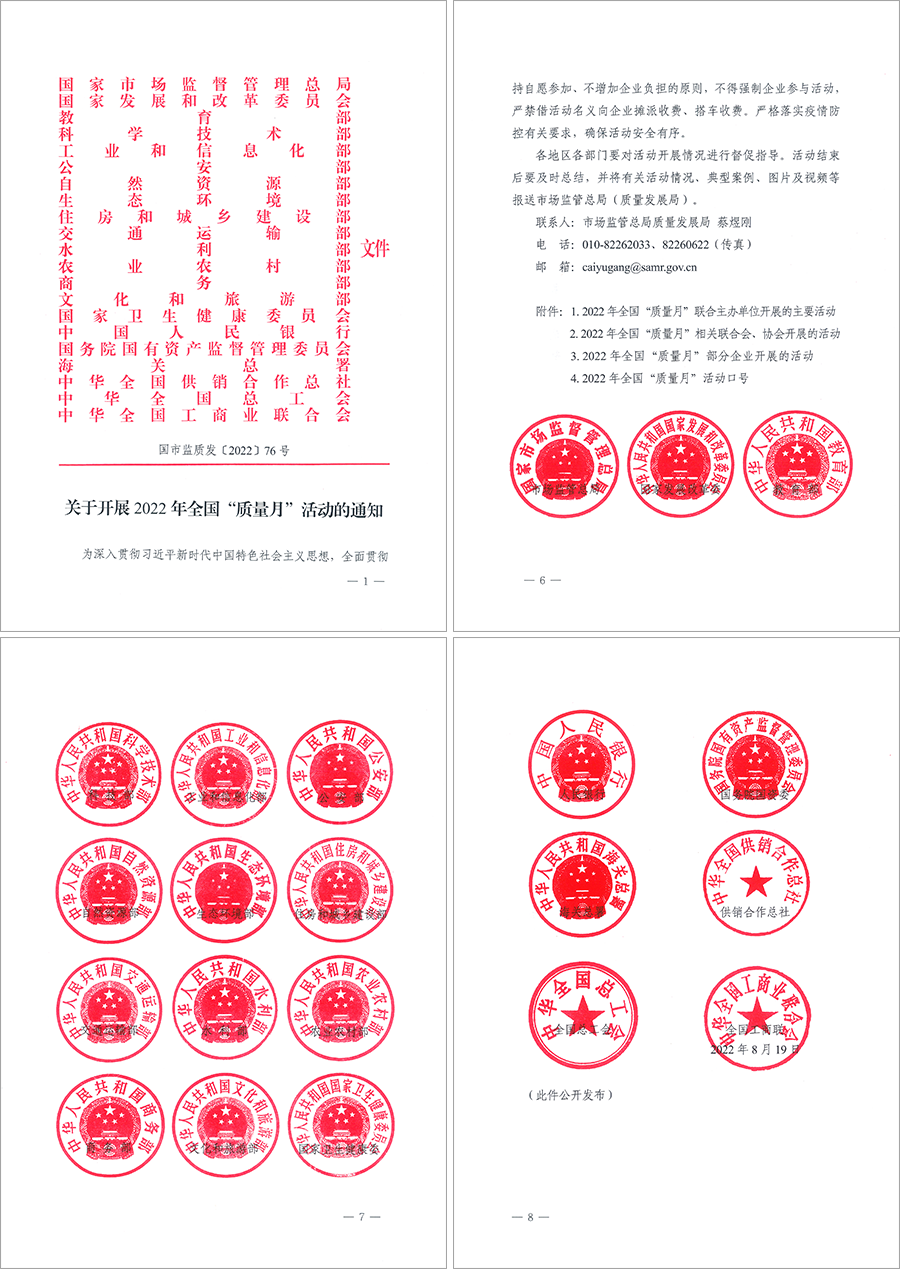 全國“質量月”活動是我國長期開展的一項重大質量活動,是在政府主管部門的倡導和部署下,聯(lián)合國家相關部委(部門)和單位并發(fā)動廣大企業(yè)與全社會積極參與,一年一度以多種形式于每年9月在全國范圍內組織開展跨時一個月并旨在提高全民質量意識和質量水平的國家級大型質量專題活動,全力營造人人關心質量、重視質量、創(chuàng)造質量、享受質量的良好社會氛圍,推進建設質量強國。